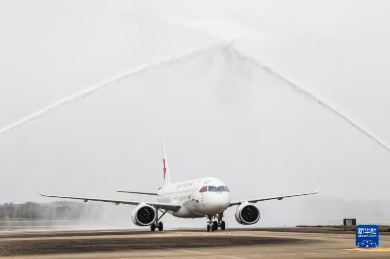 1月2日,國產(chǎn)大飛機(jī)C919降落在??诿捞m國際機(jī)場。
