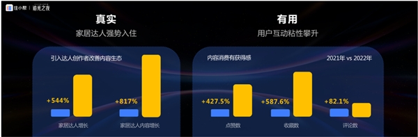 在了解了用戶需求在不斷變化后,住小幫在2022年持續(xù)通過“大投入、大發(fā)展、成體系”對平臺內(nèi)容畫風進行升級。圍繞著“專業(yè)、真實、有用”的新畫風愿景,住小幫首先在專業(yè)性上構(gòu)建了家裝行業(yè)的內(nèi)容知識圖譜,幫助設(shè)計師、達人加深對內(nèi)容生態(tài)及用戶需求的理解及滿足。其次在內(nèi)容真實性上,住小幫通過「家新計劃」,以544%的增速引入家居達人,促進平臺內(nèi)容生態(tài)向著更真實的方向改善,從大幅度增長的互動反饋中也可以看到,這些真實內(nèi)容對于用戶來說是有用的。