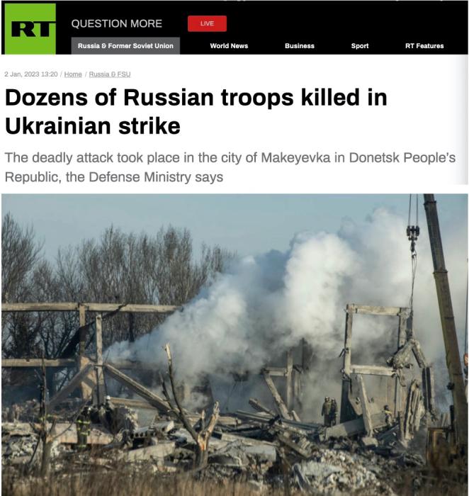 另據(jù)“今日俄羅斯”(RT)報(bào)道,烏克蘭導(dǎo)彈的目標(biāo)是俄軍駐扎的一所職業(yè)學(xué)校的建筑。襲擊恰好發(fā)生在1月1日凌晨0:01,當(dāng)時(shí)俄羅斯軍人們正在慶祝新年。