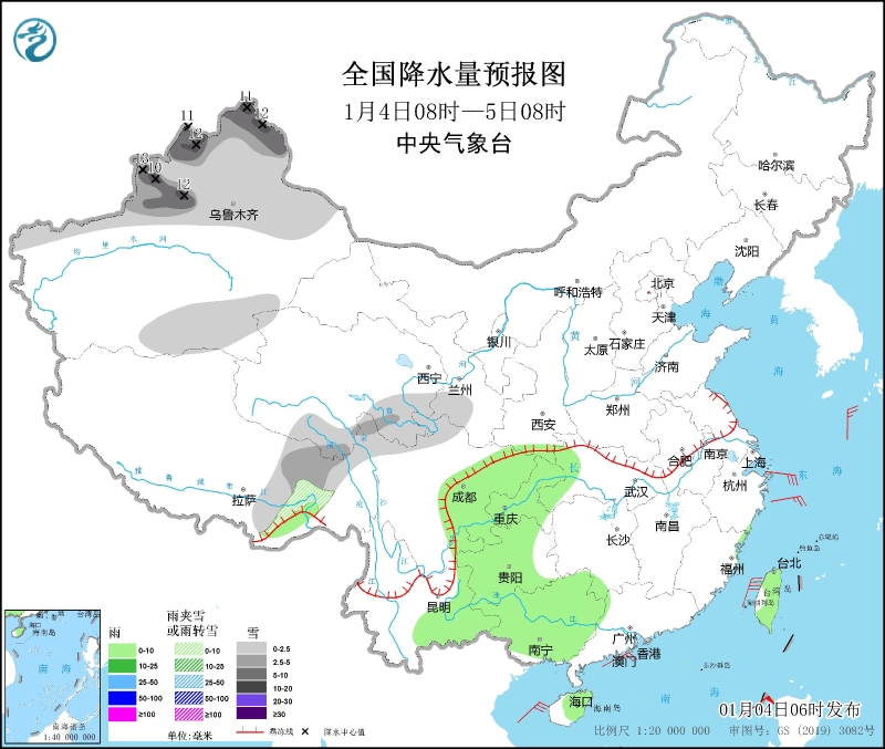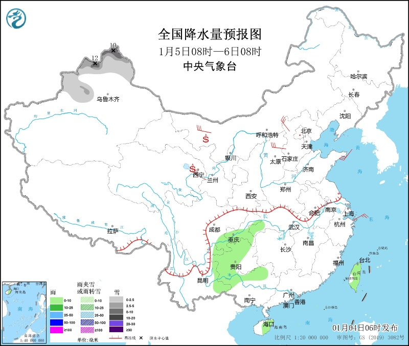 1月4日08時至5日08時,新疆北部、西藏東部、青海東南部等地部分地區(qū)有小到中雪或雨夾雪,其中,新疆塔城、阿勒泰和伊犁河谷等地部分地區(qū)有大到暴雪(10~13毫米)。湖北西部、四川盆地、重慶、貴州中西部、云南東部、廣西、海南島東部、臺灣島等地部分地區(qū)有小雨。東海南部海域、臺灣海峽、臺灣以東洋面、巴士海峽、南海大部海域?qū)⒂?~8級、陣風9級的東北風。
