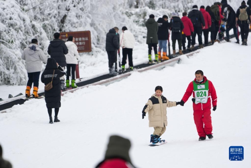 1月1日,在重慶市南川區(qū)金佛山景區(qū)滑雪場(chǎng),一名小游客在雪場(chǎng)教練的指導(dǎo)下練習(xí)滑雪。