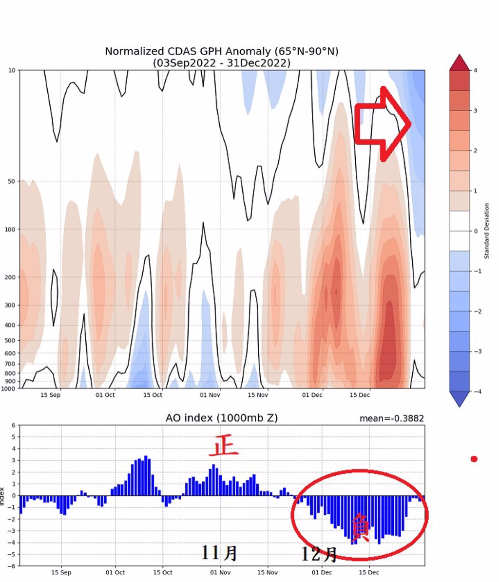 鄭明典在社交帳號貼出北極振蕩指數(shù)圖表指出,圈起來部分是剛結束的“負北極振蕩”事件,從11月底到12月底,顯著負指數(shù)持續(xù)了將近1個月。而另一張圖表則顯示北極圈上空極渦目前“快速增強中”,快速增強的高層極渦,代表北極圈上空冷空氣正快速累積,這樣不穩(wěn)定的現(xiàn)象有可能激發(fā)一次平流層暖變。當平流層暖變訊號往下傳,又可能產生極區(qū)冷空氣潰流,也就是再一次引發(fā)“負北極振蕩事件”,值得持續(xù)觀察。