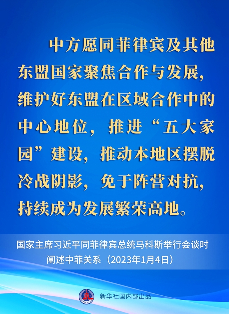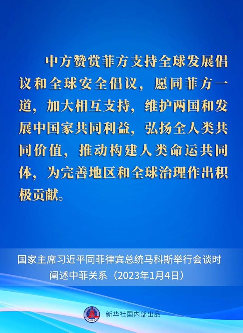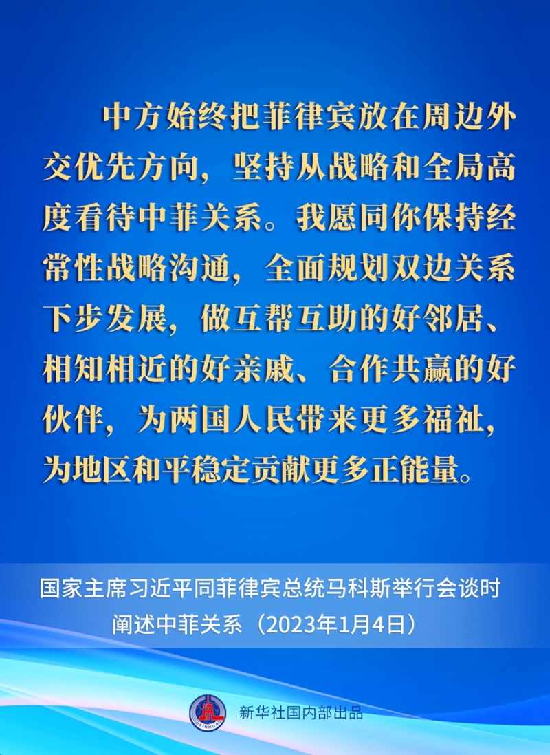 1月4日下午,國(guó)家主席習(xí)近平在人民大會(huì)堂同來(lái)華進(jìn)行國(guó)事訪問的菲律賓總統(tǒng)馬科斯舉行會(huì)談。關(guān)于中菲關(guān)系,習(xí)近平主席在會(huì)談中作出一系列重要闡述。一起來(lái)看要點(diǎn)。