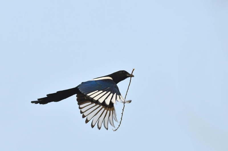 在山東省滕州市西崗鎮(zhèn),喜鵲叼著樹枝準備筑巢。新華社發(fā)(李志軍攝)