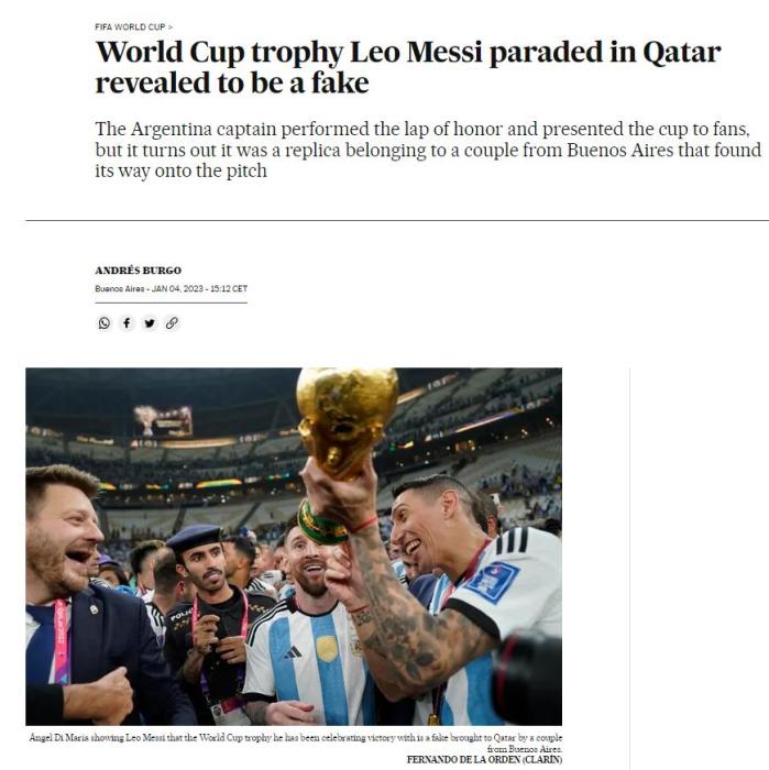 西班牙《國家報》援引阿根廷媒體4日報道稱,這個假獎杯其實來自阿根廷布宜諾斯艾利斯的一對球迷夫婦,他們把它帶到卡塔爾的初衷,是希望所有國家隊球員能在獎杯上簽名紀(jì)念。