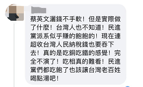 更有網(wǎng)友直言表示:“蔡英文撒錢(qián)不手軟!但是實(shí)際做了什么臺(tái)灣人也不知道,民進(jìn)黨派系似乎賺的飽飽的,現(xiàn)在連超收臺(tái)灣人民納稅錢(qián)也要吞下去!真的是吃銅吃鐵的感覺(jué),完全不演了,吃相真的難看,民進(jìn)黨們都吃飽了也該讓臺(tái)灣老百姓喝點(diǎn)湯吧!”