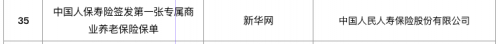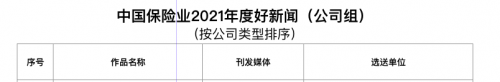 2022年1月20日,在中國保險(xiǎn)行業(yè)協(xié)會發(fā)布“中國保險(xiǎn)業(yè)2021年度好新聞”評審活動中,人保壽險(xiǎn)憑借《中國人保壽險(xiǎn)簽發(fā)第一張專屬商業(yè)養(yǎng)老保險(xiǎn)保單》,榮獲“中國保險(xiǎn)業(yè)2021年度好新聞(公司組)”獎項(xiàng)。
