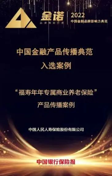 2022年5月10日,在《中國銀行保險(xiǎn)報(bào)》主辦的“2022金諾·第六屆中國金融品牌影響力傳播典范”活動中,人保壽險(xiǎn)旗下的“福壽年年專屬商業(yè)養(yǎng)老保險(xiǎn)”產(chǎn)品傳播案例,榮獲“金諾·中國金融產(chǎn)品傳播典范”殊榮。