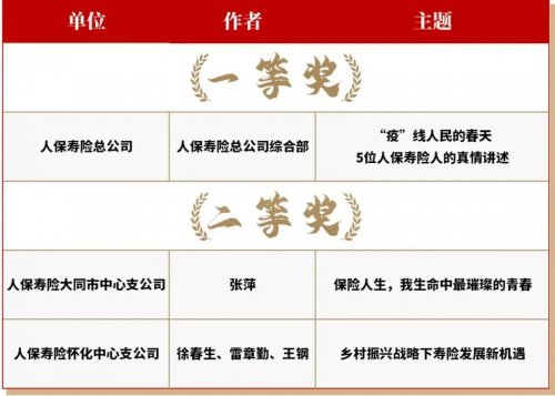 2022年10月13日,在中國金融政研會組織全國金融系統(tǒng)開展的“非凡十年 人民金融”主題征文活動中,人保壽險(xiǎn)報(bào)送的《“疫”線人民的春天5位人保壽險(xiǎn)人的真情講述》,榮獲2022年全國金融系統(tǒng) “非凡十年 人民金融”主題征文一等獎。