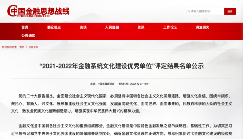 2022年12月8日,在中國金融思想政治工作研究會組織開展的“2021-2022年金融系統(tǒng)文化建設(shè)優(yōu)秀單位”評定活動中,人保壽險(xiǎn)榮獲“2021-2022年金融系統(tǒng)文化建設(shè)優(yōu)秀單位”。