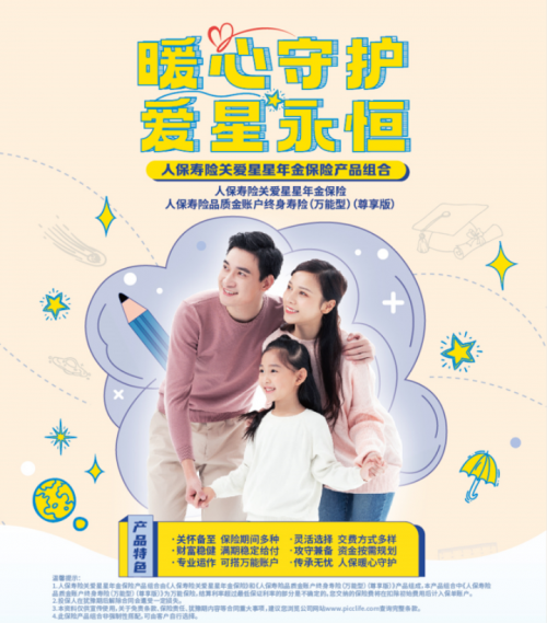 溫馨提示:1.人保壽險關(guān)愛星星年金保險產(chǎn)品組合由《人保壽險關(guān)愛星星年金保險》和《人保壽險品質(zhì)金賬戶終身壽險(萬能型) (尊享版) 》產(chǎn)品組成,本產(chǎn)品組合中《人保壽險品質(zhì)金賬戶終身壽險(萬能型) (尊享版)》 為萬能保險,結(jié)算利率超過最低保證利率的部分是不確定的。您交納的保險費將在扣除初始費用后計入保單賬戶。2.投保人在猶豫期后解除合同會遭受一定損失。3.本資料僅供宣傳使用,關(guān)于免責(zé)條款、保險責(zé)任、猶豫期內(nèi)容等合同重大事項,建議您瀏覽公司網(wǎng)站查詢完整條款。4.此保險產(chǎn)品組合非強制性搭配,可由客戶自行選擇。
