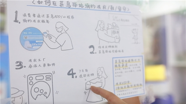 菜鳥驛站里來洗衣服的大多是較為年輕的寶媽群體,但也有些叔叔阿姨,他們對(duì)線上洗衣的流程并不熟悉,時(shí)常有叔叔阿姨直接把手機(jī)給店員操作下單,為此方俊夫妻二人拜托自己網(wǎng)店的美工同事定制了一套操作指南,用手繪動(dòng)漫的形式將下單的流程介紹給叔叔阿姨。夫妻二人把這套手繪圖放到了洗衣區(qū)的前臺(tái),供叔叔阿姨們比對(duì)操作,手繪操作指南完成后立馬受到了社區(qū)居民的歡迎和好評(píng)。