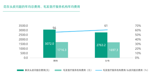 當(dāng)前,脫發(fā)成為了現(xiàn)代人的困擾之一,同時(shí)脫發(fā)也拉響了“頭皮健康”的警報(bào)。近日,由中國(guó)社會(huì)科學(xué)院國(guó)情調(diào)查與大數(shù)據(jù)研究中心與《南方周末》共同發(fā)布《2022都市人群毛發(fā)健康消費(fèi)白皮書(shū)》(以下簡(jiǎn)稱“白皮書(shū)”)顯示,消費(fèi)者最近兩年花在頭皮問(wèn)題的平均費(fèi)用接近3000元/年,其中有1711元是用在毛發(fā)醫(yī)療服務(wù)機(jī)構(gòu)的治療和養(yǎng)護(hù)上面的,占比57%。其中,女性花在毛發(fā)醫(yī)療服務(wù)機(jī)構(gòu)的費(fèi)用占總費(fèi)用的61%,明顯高于男性(56%)。