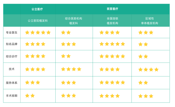 據(jù)此次白皮書(shū)調(diào)研數(shù)據(jù)顯示,基于消費(fèi)者選擇毛發(fā)醫(yī)療服務(wù)機(jī)構(gòu)的考慮因素,從專業(yè)醫(yī)生、知名品牌、綜合診療、技術(shù)、服務(wù)體系(包含手術(shù)排期)這幾個(gè)維度分析四大類植發(fā)機(jī)構(gòu)(區(qū)域性/單體機(jī)構(gòu)、全國(guó)連鎖植發(fā)機(jī)構(gòu)、綜合醫(yī)美機(jī)構(gòu)和公立醫(yī)院)的優(yōu)劣勢(shì)。整體可以看出雍禾植發(fā)等全國(guó)連鎖植發(fā)機(jī)構(gòu)的綜合優(yōu)勢(shì)更突出。