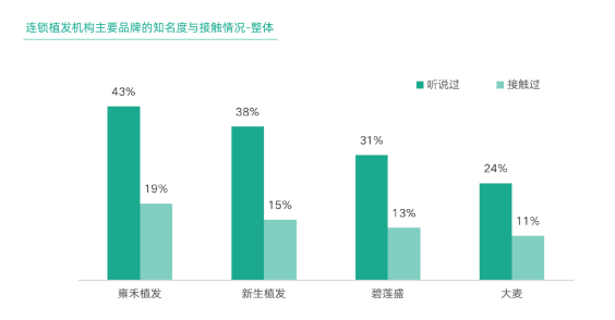 在品牌知曉率上,43%的受訪者聽(tīng)說(shuō)過(guò)雍禾植發(fā),其次是新生植發(fā)(38%);在市場(chǎng)接觸率上,接觸過(guò)專業(yè)植發(fā)機(jī)構(gòu)的人群中,占比最高的是雍禾植發(fā)(19%)。