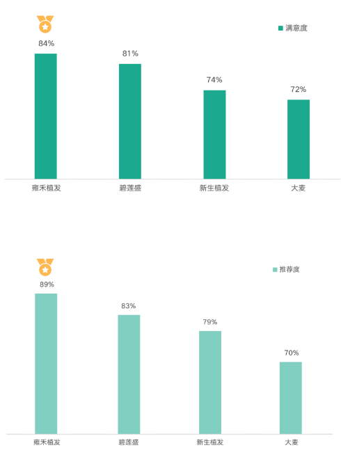 在用戶評(píng)價(jià)上,用戶對(duì)連鎖植發(fā)機(jī)構(gòu)的滿意度整體較高,均超過(guò)70%。其中,雍禾植發(fā)的用戶滿意度和推薦度均位列第一,接近85%。
