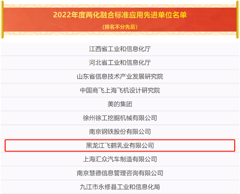 近日,全國兩化融合標(biāo)委會(huì)(TC573)公布2022年度兩化融合標(biāo)準(zhǔn)化工作先進(jìn)集體、先進(jìn)個(gè)人、標(biāo)準(zhǔn)應(yīng)用先進(jìn)單位名單。憑借近年來在兩化深度融合方面的突出貢獻(xiàn),中國飛鶴、中國商飛上海飛機(jī)設(shè)計(jì)研究院等獲評(píng)“2022年度兩化融合標(biāo)準(zhǔn)應(yīng)用先進(jìn)單位”。作為唯一上榜乳企,飛鶴的全生態(tài)數(shù)字化能力再次受到全國性專業(yè)組織肯定。