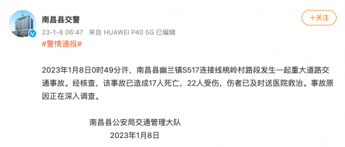 2023年1月8日0時49分許,江西省南昌縣幽蘭鎮(zhèn)S517連接線桃?guī)X村路段發(fā)生一起重大道路交通事故。截至1月8日7時,已造成17人死亡,22人受傷,傷者已及時送醫(yī)院救治。