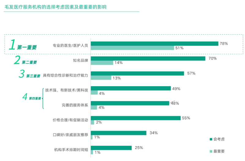 白皮書調(diào)研顯示,“好醫(yī)生”已經(jīng)成為消費(fèi)者在選擇毛發(fā)醫(yī)療服務(wù)機(jī)構(gòu)時考慮的最重要因素,有51%消費(fèi)者認(rèn)為專業(yè)的醫(yī)生與醫(yī)護(hù)人員(好醫(yī)生)是選擇毛發(fā)醫(yī)療服務(wù)機(jī)構(gòu)的最重要因素,認(rèn)為技術(shù)最重要的消費(fèi)者僅有4%。作為“好醫(yī)生”理念的提出者,雍禾醫(yī)療在這場曠日持久的爭議中獲得了勝利。