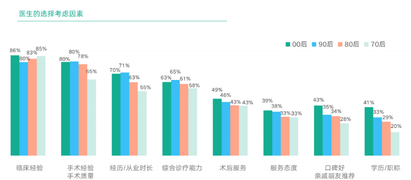 白皮書調(diào)研數(shù)據(jù)顯示,從70后到00后,醫(yī)生的臨床經(jīng)驗、手術(shù)經(jīng)驗手術(shù)質(zhì)量都毫無爭議的排在了選擇醫(yī)生時考慮因素的前兩位,而這些因素都指向了一個結(jié)果:效果。大家都想選出一個能給自己帶來好的植發(fā)效果的好醫(yī)生。