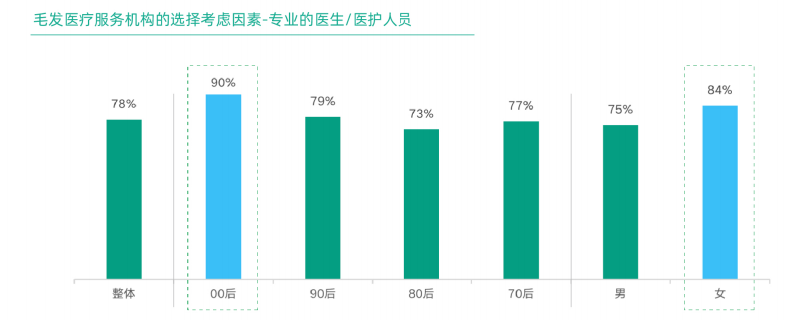 社科院白皮書也證實了這一趨勢。白皮書調(diào)研顯示,90%的00后在選擇毛發(fā)醫(yī)療服務(wù)機(jī)構(gòu)時更看重“好醫(yī)生”。