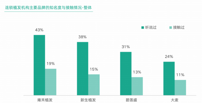 在品牌知曉度與市場接觸率上,雍禾醫(yī)療領(lǐng)先行業(yè)其他品牌。在品牌知曉率上,43%的受訪者聽說過雍禾醫(yī)療,其次是新生植發(fā)(38%)。在市場接觸率上,接觸過專業(yè)植發(fā)機(jī)構(gòu)的人群中,占比最高的是雍禾醫(yī)療(19%)。