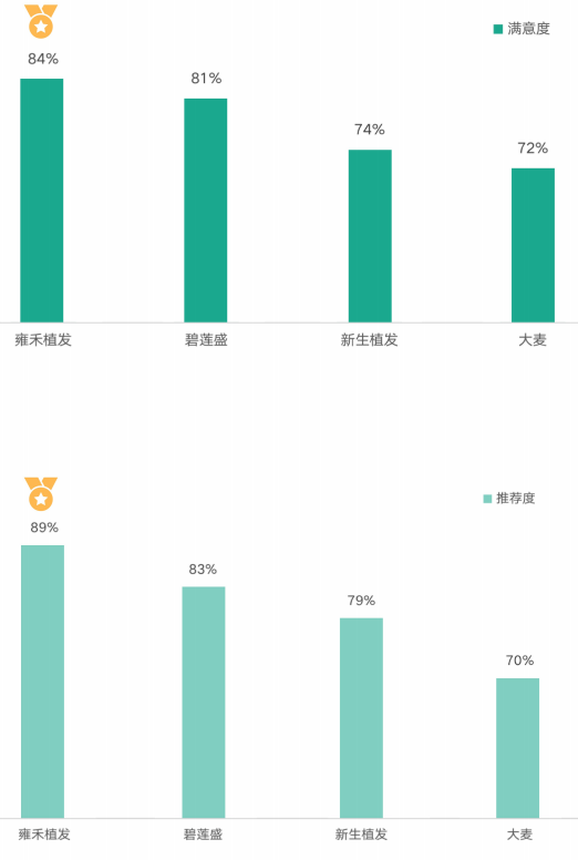 雍禾醫(yī)療的用戶滿意度和推薦度均位列第一:在用戶評價上,用戶對連鎖植發(fā)機(jī)構(gòu)的滿意度整體較高,均超過70%。其中,雍禾醫(yī)療的用戶滿意度和推薦度均位列第一,雍禾醫(yī)療滿意度達(dá)84%,推薦度更高達(dá)89%。