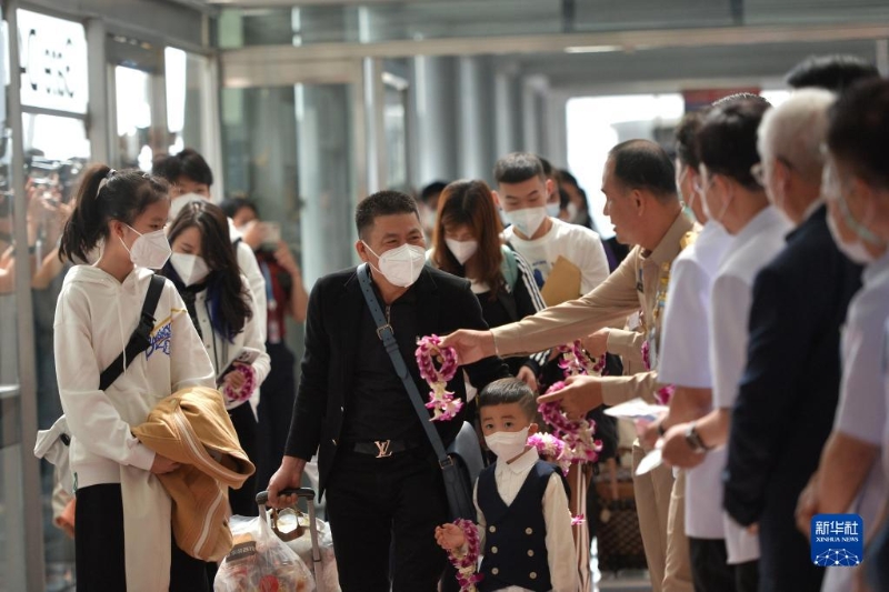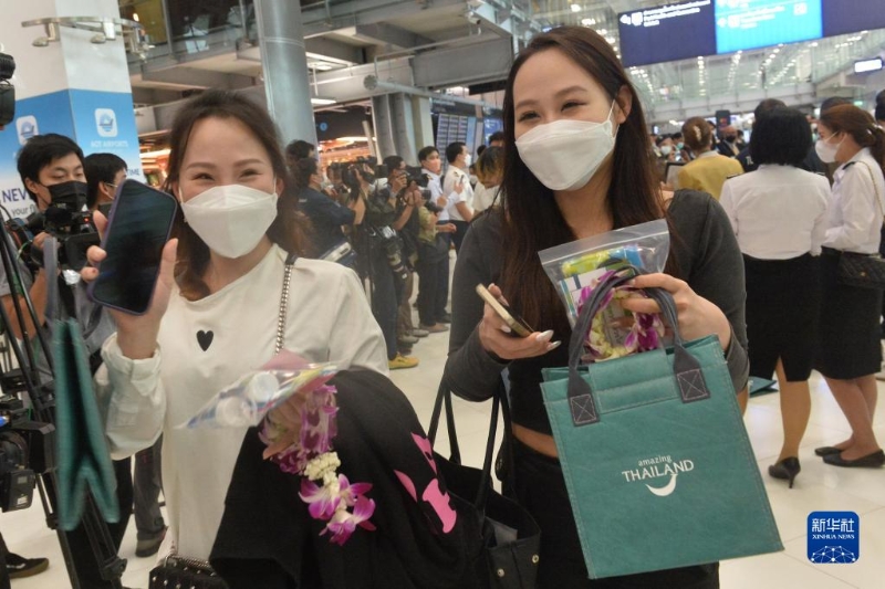 當(dāng)日,泰國素萬那普機場舉行儀式歡迎中國出入境政策調(diào)整后首個中國赴泰國航班旅客,泰國副總理兼衛(wèi)生部長阿努廷到現(xiàn)場迎接。該航班來自廈門,共搭載269名旅客。新華社發(fā)(拉亨攝)