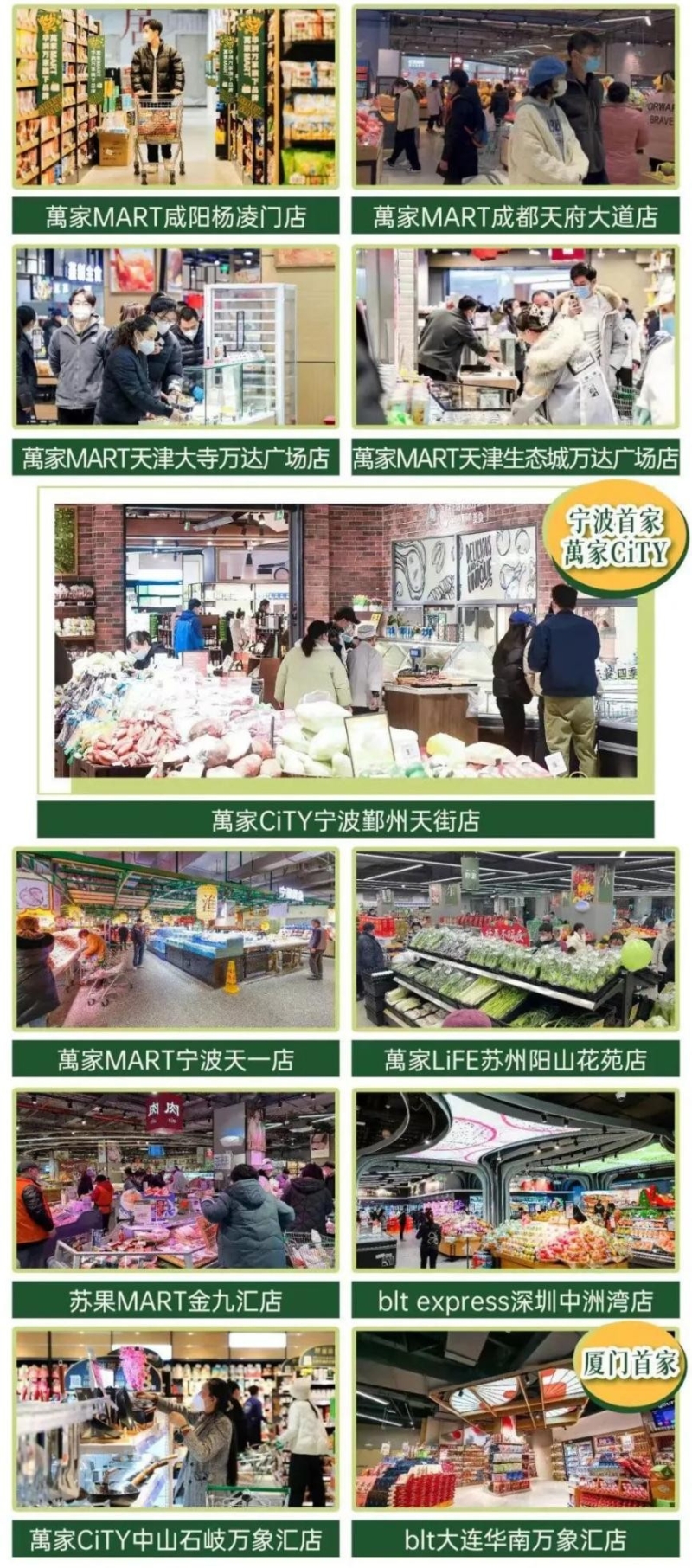 2022年1月,萬(wàn)家MART在蘭州、寶雞、延安、咸陽(yáng)等四店開(kāi)業(yè);4月,萬(wàn)家MART大連星河廣場(chǎng)店開(kāi)業(yè);5月,萬(wàn)家MART深圳坪地中心店開(kāi)業(yè);6月,萬(wàn)家CITY浙江首店開(kāi)業(yè);10月,萬(wàn)家MART紹興首店正式落地......