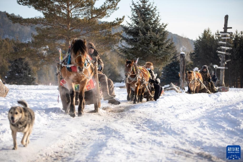 1月10日,在漠河市北極村,游客乘坐馬拉爬犁。