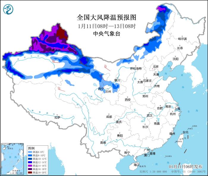 11日08時至13日08時,新疆大部、甘肅中西部、寧夏中南部、內(nèi)蒙古大部等地氣溫下降6~10℃,新疆北疆大部降溫12~18℃,局地20℃以上,上述地區(qū)將有4~6級風,陣風7~8級,新疆山口風力可達8~10級(見圖2)。中央氣象臺1月11日06時繼續(xù)發(fā)布寒潮藍色預警。
