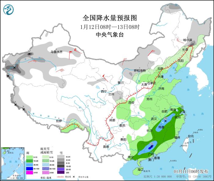 圖3 全國降水量預報圖(1月11日08時-12日08時)