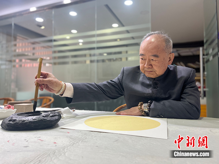 圖為1月5日,朱榮智在安徽合肥的薪傳文化會館中提筆寫毛筆字。 中新社記者 儲瑋瑋 攝
