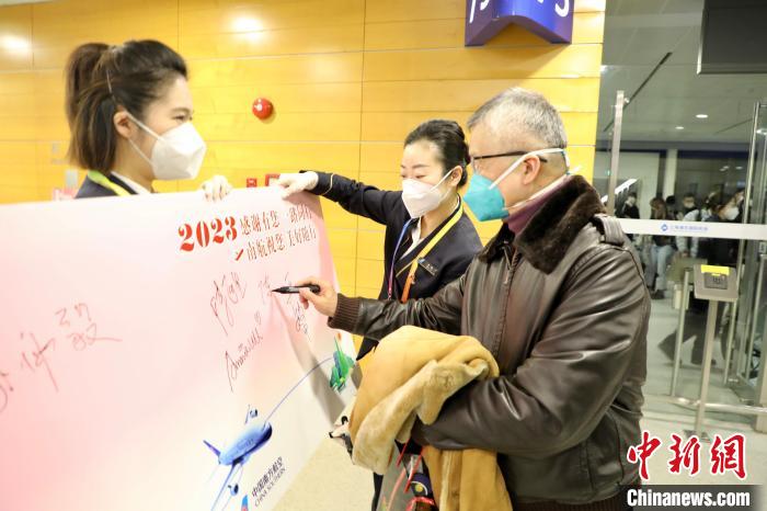 根據(jù)新措施,入境旅客在海關(guān)檢驗(yàn)檢疫區(qū)只需出示健康申報(bào)碼即可快速通關(guān)。享受新政帶來(lái)的快捷通關(guān)體驗(yàn)的旅客和脫下“大白”的工作人員共同在紀(jì)念簽名板上簽名留念。