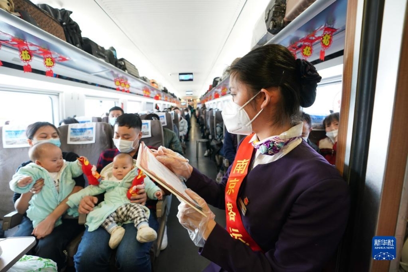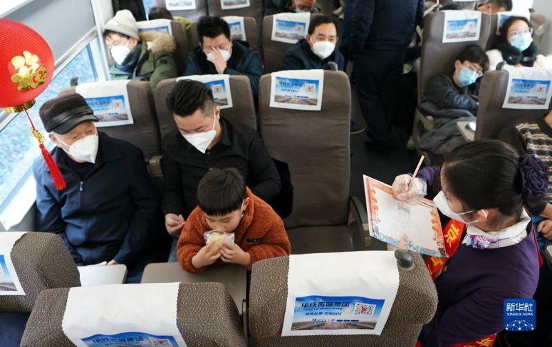 當日,中國鐵路上海局集團有限公司南京客運段高鐵二車隊在D376次列車上開展“回家路上的笑容”繪畫活動,列車員現(xiàn)場為旅客作畫,送上新年祝福。