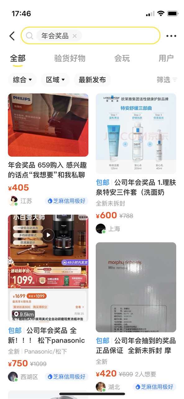 其實正因為年會獎品的選擇重口難調(diào),也因此催生了一個巨大的閑置交易市場。作為中國最大的線上閑置交易平臺,閑魚在年關(guān)將至?xí)r,便自然成為了買賣雙方的交易陣地,于是出現(xiàn)了賣方閑魚轉(zhuǎn)手賺到新年第一桶金,買方低價撿漏,抓住一波紅利的現(xiàn)象。
