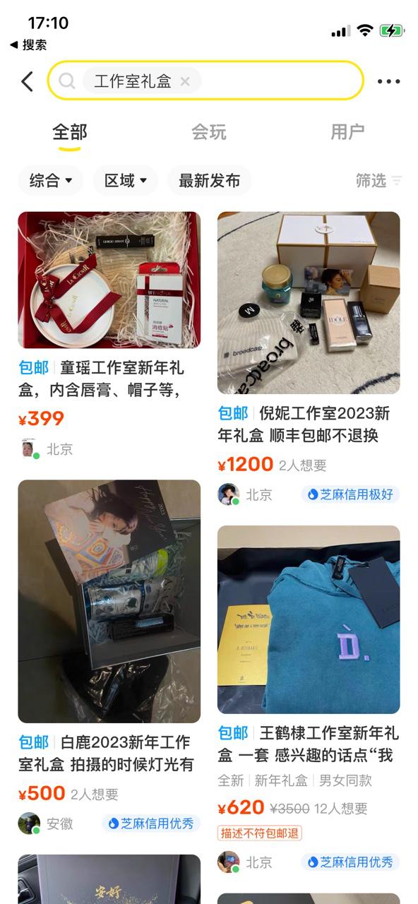 在閑魚上搜索“年會獎品”、“新年禮盒”、“明星禮盒”,出現(xiàn)的品牌、品類、明星周邊可以說琳瑯滿目,十分受歡迎。尤其是明星工作室的禮盒,因其明星效應(yīng)引發(fā)粉絲“哄搶”;而一些美妝大牌的年會禮盒也成為眾網(wǎng)友“蹲守”的重點目標(biāo)。