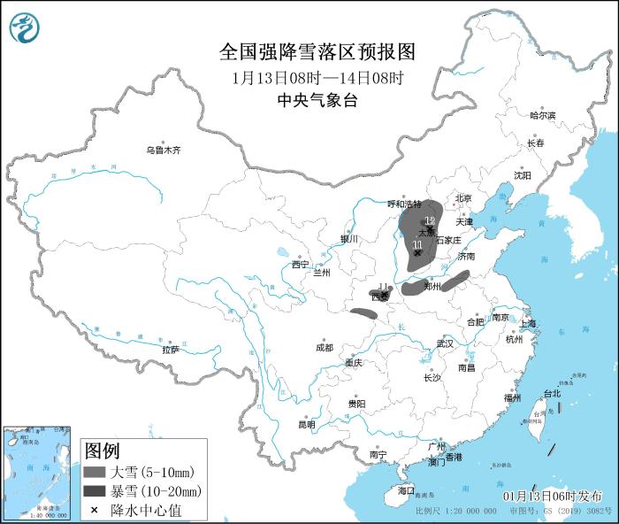 中新網(wǎng)1月13日電 據(jù)中央氣象臺網(wǎng)站消息,受強冷空氣影響,預計1月13日08時至1月16日08時,寒潮天氣將影響我國中東部地區(qū),氣溫將先后下降8~12℃,中央氣象臺1月13日06時發(fā)布寒潮橙色預警;預計1月13日08時至1月14日08時,陜西南部、山西、河北西部、河南西部和東部、山東西南部等地的部分地區(qū)有大雪,中央氣象臺1月13日06時發(fā)布暴雪藍色預警?! ?/p>
