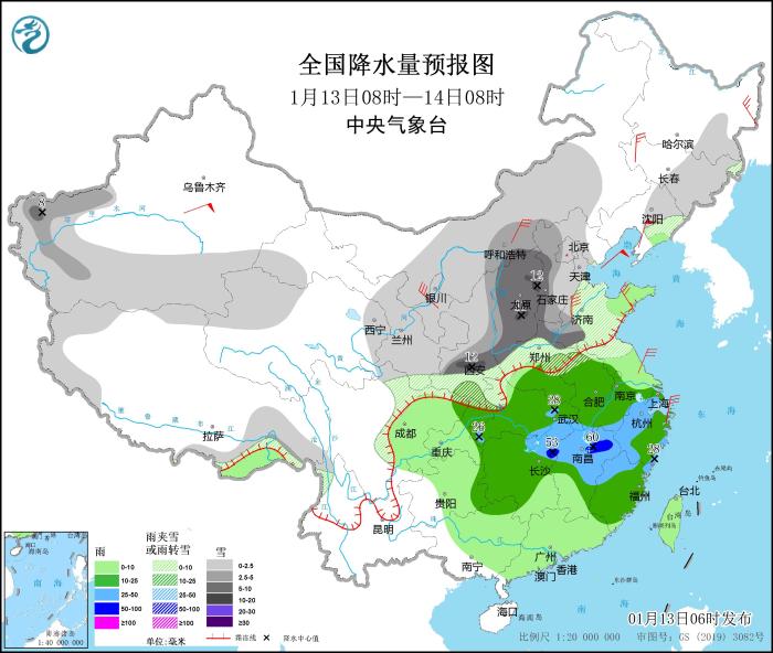 1月13日08時至14日08時,新疆南疆盆地、甘肅西部和中南部、青海西部、內(nèi)蒙古中部、黑龍江東南部、吉林東部和遼寧東部、西北地區(qū)東部、華北、黃淮中北部等地部分地區(qū)有小到中雪或雨夾雪,新疆南疆西部山區(qū)、陜西南部、山西、河北西部、河南西部和東部、山東西南部等地部分地區(qū)有大雪,其中,陜西南部、山西東部和中部、河北西部等地的部分地區(qū)有暴雪(10~12毫米)。黃淮中南部、江淮、江漢、江南、西南地區(qū)東部、華南等地部分地區(qū)有小到中雨,其中,安徽南部、湖北西南部和東部、湖南東北部、江西中北部、浙江西部和北部、福建西北部等地部分地區(qū)有大到暴雨(25~60毫米)。新疆東部和南疆盆地、甘肅河西、內(nèi)蒙古中東部、遼寧中東部、山東東部、江蘇和浙江沿海地區(qū)等地部分地區(qū)有4~6級風,陣風7-9級,其中,新疆山口風力可達10級或以上。東部海區(qū)有7~9級風,陣風可達10~11級(見圖5)。