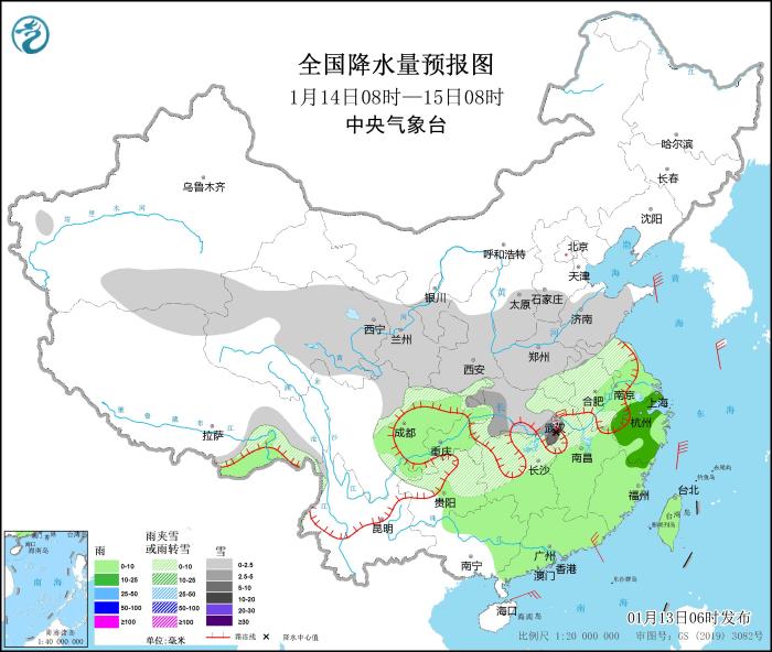 圖5 全國降水量預報圖(1月13日08時-14日08時)