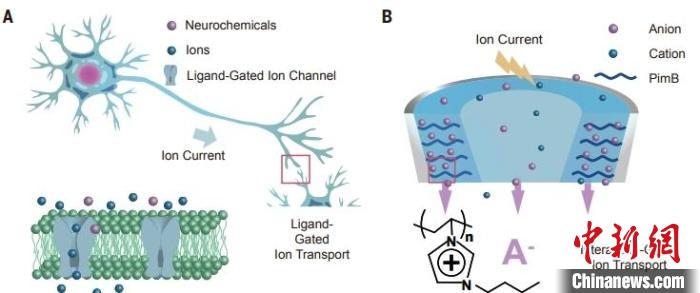 神經(jīng)元(A)和納流體憶阻器(B)示意圖。 中科院化學(xué)所 供圖