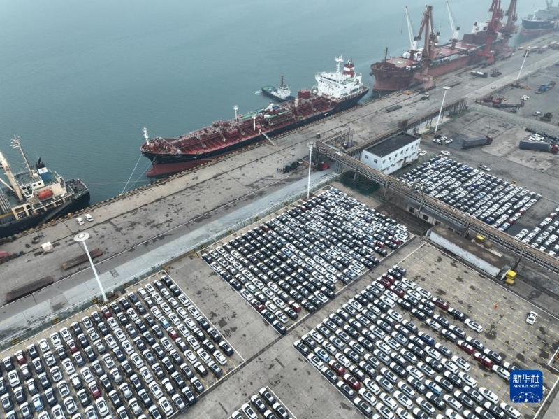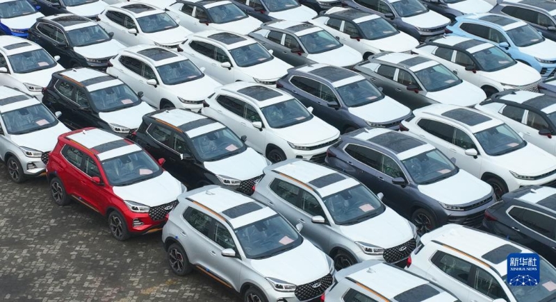 1月13日,在江蘇連云港港口碼頭,一批國產(chǎn)小汽車在等待裝船出口海外(無人機(jī)照片)。新華社發(fā)(耿玉和 攝)