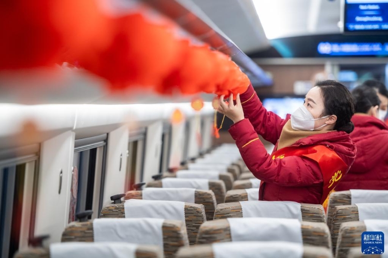 1月7日,在武漢站,乘務(wù)員在列車上掛新年燈籠。新華社記者 伍志尊 攝