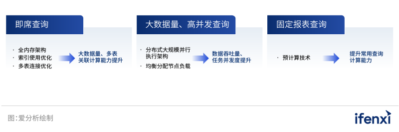 針對現(xiàn)有數(shù)據(jù)庫在性能上的欠缺,分析型數(shù)據(jù)庫廠商著重提升了即席查詢、大規(guī)模數(shù)據(jù)高并發(fā)執(zhí)行、固定報表等方面的性能來滿足企業(yè)用數(shù)需求。具體從以下方面著手解決問題: