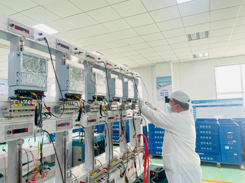 2022年12月,在威勝集團有限公司生產(chǎn)車間內(nèi),工人對智能電表進行校驗。(受訪者供圖)