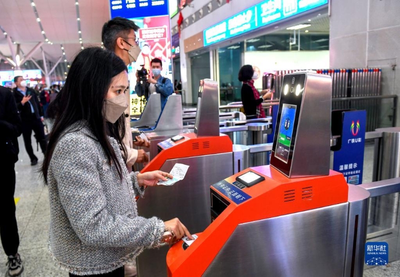 1月15日,在深圳北站,搭乘恢復(fù)通車(chē)后內(nèi)地駛往香港首趟列車(chē)G5607次的乘客通過(guò)閘機(jī)進(jìn)站。新華社記者 毛思倩 攝
