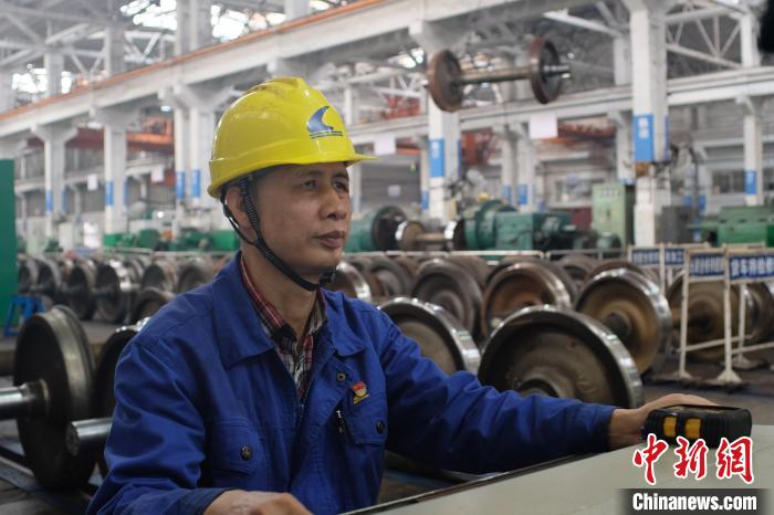 15日,在柳州機(jī)車車輛有限公司的轉(zhuǎn)向架車間內(nèi),59歲的肖光信手持超聲波探頭,對一條鐵道車輛輪對進(jìn)行探測。隨著手臂的反復(fù)移動,電腦屏幕上的超聲波紋不斷跳動,他沉穩(wěn)地盯著每一處變化。