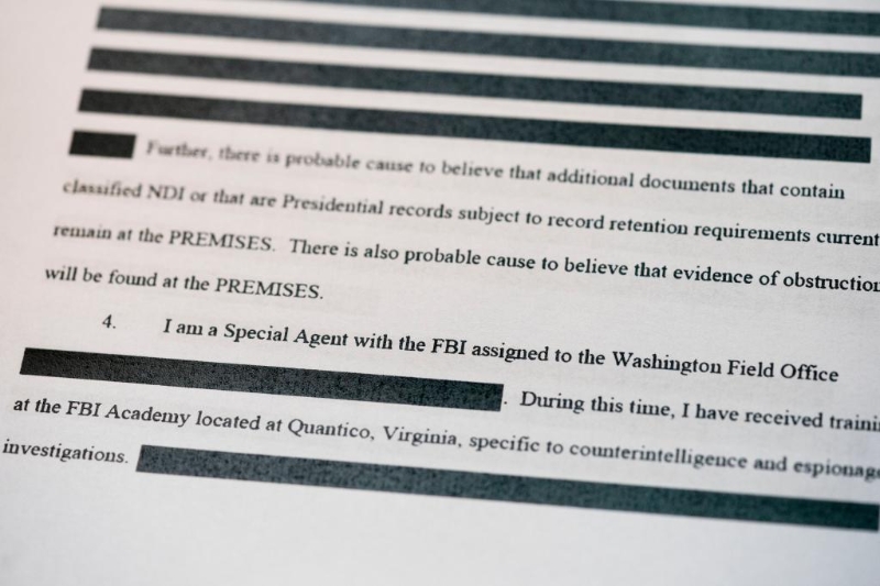 2022年8月26日,美國(guó)司法部公布聯(lián)邦調(diào)查局申請(qǐng)搜查前總統(tǒng)特朗普住所海湖莊園時(shí)向法院提交書(shū)面證詞的部分內(nèi)容。這份38頁(yè)的文件有大量?jī)?nèi)容被涂黑加密。司法部解釋說(shuō),這是為了保護(hù)證人不受恐嚇或報(bào)復(fù)。新華社記者劉杰攝