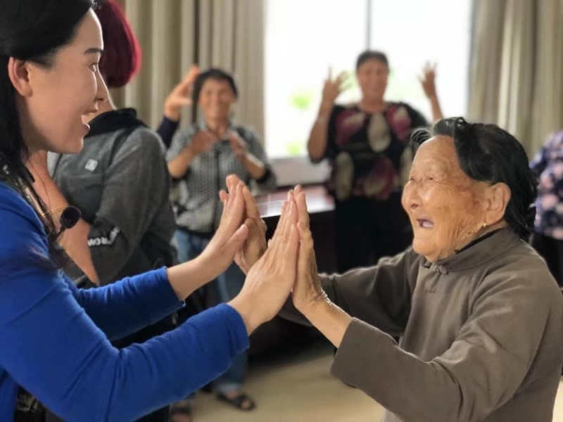 2021年9月,志愿者教師與姜后村98歲高齡的許鳳仙老人在樂齡學堂互動。(受訪者供圖)