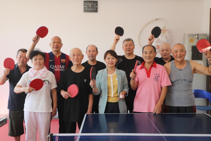 2022年7月21日,撫順社區(qū)黨委書記郝麗影(前排左三)與轄區(qū)內老人在乒乓球比賽后合影。(受訪者供圖)